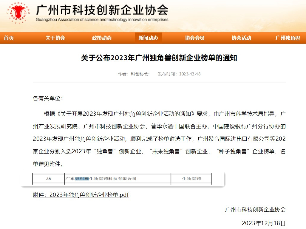 根據廣州市科技創(chuàng )新企業(yè)協(xié)會(huì )網(wǎng)12月18日《關(guān)于公布2023年廣州獨角獸創(chuàng )新企業(yè)榜單的通知》內容所示,天科雅入選2023年“未來(lái)獨角獸”創(chuàng )新企業(yè)榜單。
