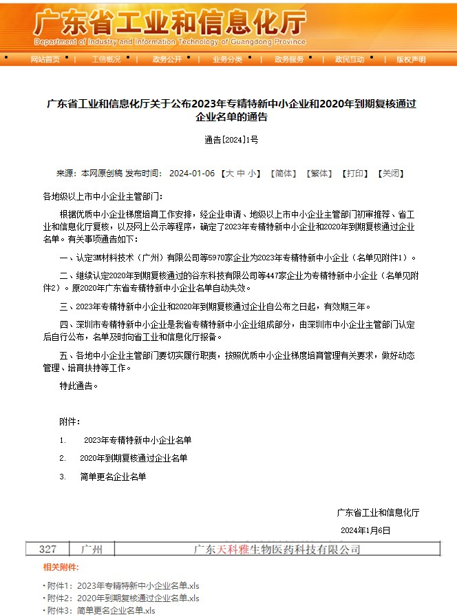 2024年1月6日,廣東省工業(yè)和信息化廳公示2023年專(zhuān)精特新中小企業(yè)名單,經(jīng)過(guò)市區推薦,合規審查,專(zhuān)家評審等,天科雅榜上有名,喜獲廣東省“專(zhuān)精特新”中小企業(yè)認定。