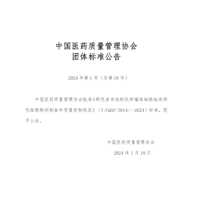 2024年5月1日,由中國醫藥質(zhì)量管理協(xié)會(huì )發(fā)布的《研究者發(fā)起的抗腫瘤體細胞臨床研究細胞制劑制備和質(zhì)量控制規范》(T/CQAP 3014—2024)標準(以下簡(jiǎn)稱(chēng)“標準”)將正式實(shí)施。