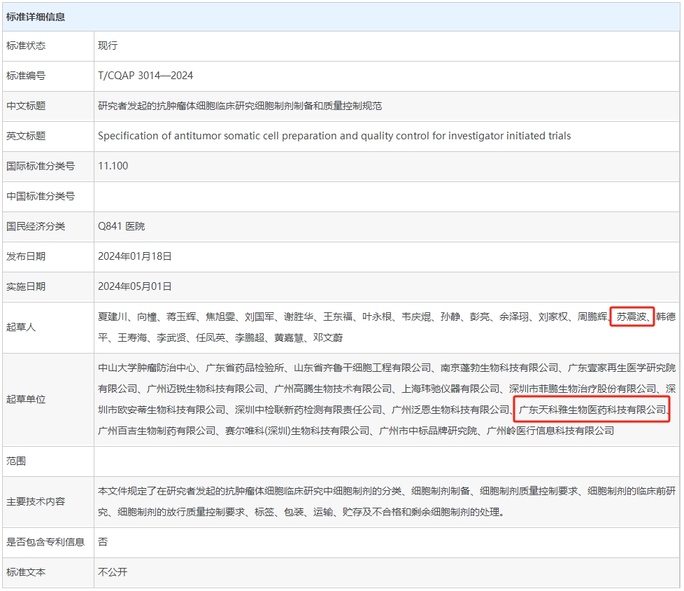 中山大學(xué)腫瘤防治中心主任導師兼中國醫藥質(zhì)量管理協(xié)會(huì )細胞治療質(zhì)量控制與研究專(zhuān)業(yè)委員會(huì )主任委員夏建川、實(shí)驗研究部副研究員向橦、廣東省藥品檢驗所一級主任科員蔣玉輝、廣東天科雅生物醫藥科技有限公司等參與起草,助力推動(dòng)中國抗腫瘤體細胞臨床研究。