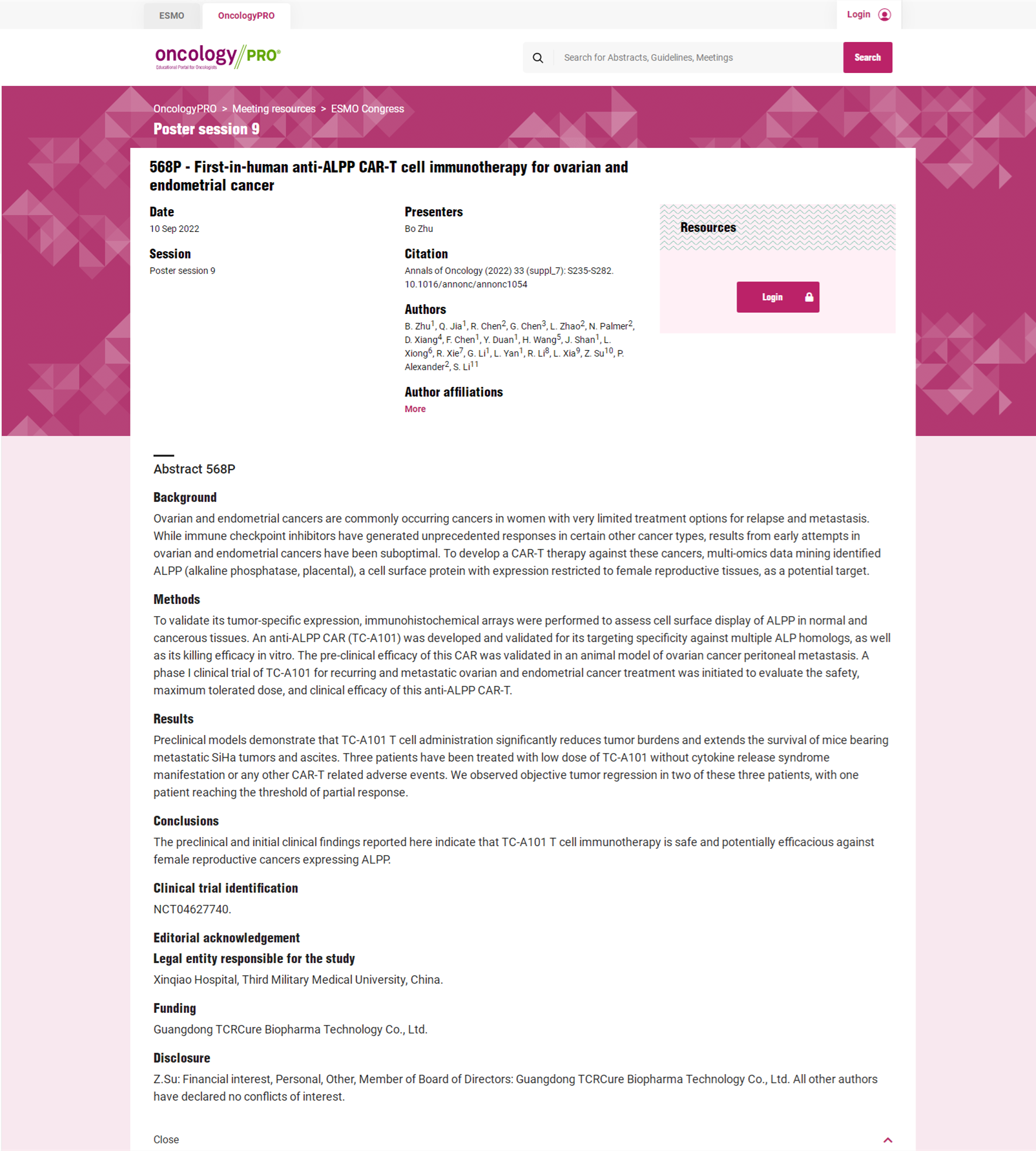標題: First-in-human anti-ALPP CAR-T cell immunotherapy for ovarian and endometrial cancer 首個(gè)用于人體內卵巢癌和子宮內膜癌的抗 ALPP 的CAR-T 細胞免疫療法