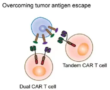 而所謂的多靶點(diǎn)CAR-T細胞,主要是設計用于靶向不同的腫瘤抗原,包括具有兩個(gè)CAR的雙CAR-T細胞或具有多個(gè)單鏈抗體(scFv)的串聯(lián)CAR-T細胞。這種多靶點(diǎn)CAR-T, 理論上能夠克服腫瘤抗原異質(zhì)性與腫瘤抗原逃逸