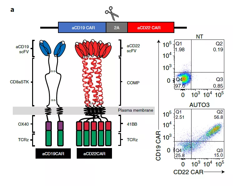 2021年10月12日,Nature Medicine期刊上公布了抗CD19和抗CD22 CAR的自體轉導T細胞(AUTO3)在復發(fā)性或難治性B-ALL(n=15)的兒童和年輕成年患者中的I期試驗,以評估AUTO3的療效。