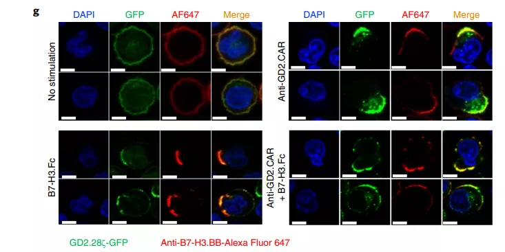 在共聚焦顯微鏡成像顯示CARs在表達GFP標記的GD2.28ζ(綠色)和B7-H3.BB(紅色)的T細胞中聚集,能夠靶向神經(jīng)母細胞瘤細胞,并觀(guān)察殺傷效果。在隨后植入了神經(jīng)母細胞瘤的小鼠上,也驗證了雙靶向CAR-T細胞療法的優(yōu)異抗腫瘤結果。